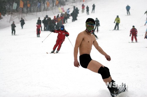 2月7日,备受瞩目的沈阳首届“光猪”滑雪狂欢节在沈阳森林公园东北亚滑雪场举行。当天,数十名参赛选手甩掉笨重冬装,换上泳装,纵情雪上。