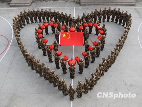 2月10日,浙江温州边防支队新兵连100多名战士利用训练间隙在操场上组成一个美丽的“心”字形图案,给远方的亲人和女友送去祝福,迎接即将到来的新春佳节和情人节。