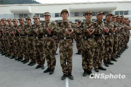 浙江温州边防支队新兵连100多名战士利用训练间隙在操场上组成一个美丽的“心”字形图案,给远方的亲人和女友送去祝福。中新社发 吴水斌 摄