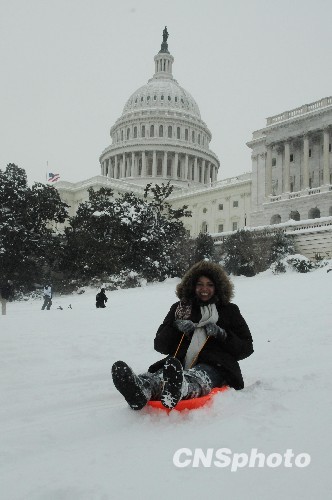 2月9日晚间至10日,一场暴风雪再度袭击美国东海岸,首都华盛顿继前几日暴风雪之后又一次陷入麻烦,政府部门关门、学校听课、机场航班取消,整个城市几乎“瘫痪”。图为10日一名滑雪爱好者在著名的国会山前滑雪。中新社发 吴庆才 摄