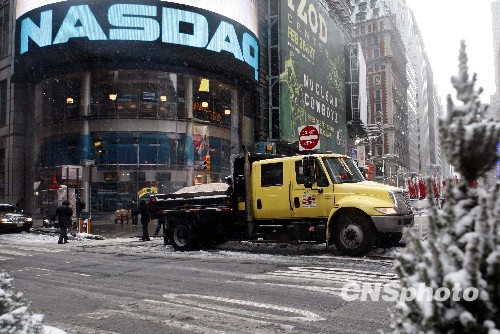 新一轮暴雪9日晚再度袭击美东地区,纽约也未能幸免。图为纽约时代广场除雪车在撒除雪的盐沙。中新社发 孙宇挺 摄