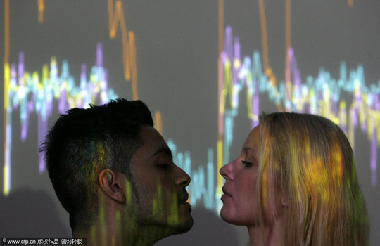 2010年2月9日,英国,伦敦:模特cathrine andersson和dipesh davadra正在被拍摄一系列接吻照片,以供仪器检测他们气息中的化学物质。这项实验是通过视觉方式来分析气味中的例子,以期能帮助人们寻找最完美的情人节伴侣。