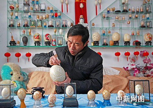 2010年2月11日,民间艺人赵海群展示了他的蛋雕福虎。