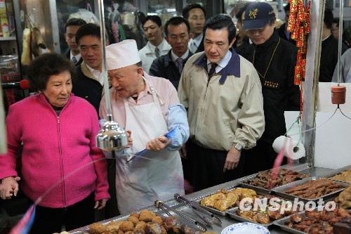 图为在谢普庆老人(左二)的47号摊位,马英九母子点要了卤味牛肚、牛筋和卤大肠。中新社发 耿军 摄