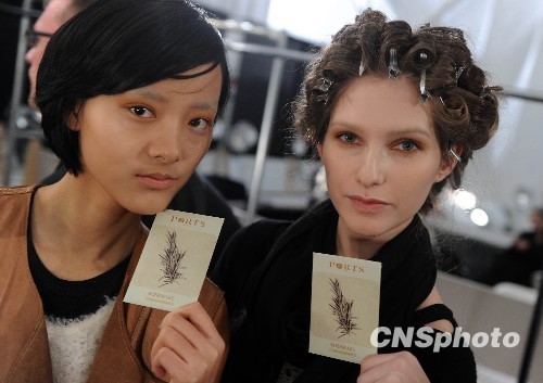 来自中国的国际名模裴蓓(左)与外模共同展示PORTS1961时装秀的请柬:迷迭香的种子。中新社发 徐常盛 摄