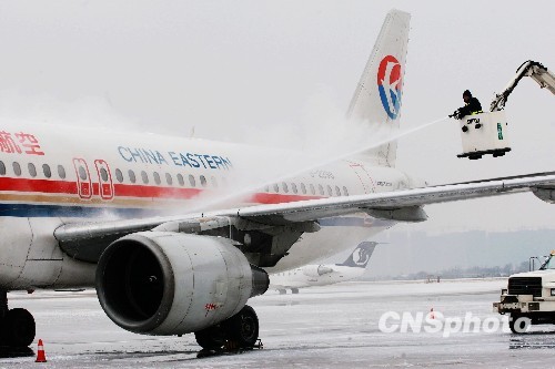 地勤人员为飞机除冰雪。中新社发 李博 摄