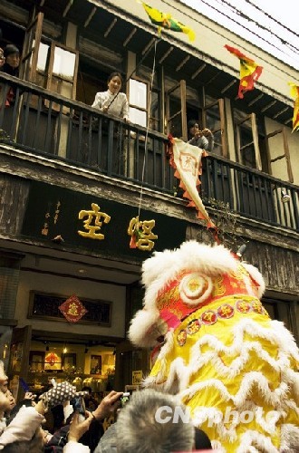 2月14日中国农历大年初一,日本横滨中华街举办传统的舞狮活动。由横滨中华学校校友会国术团组成的舞狮队伍,挨个在中华街的商店门口舞动讨“彩头”,祝商家财运滚滚来。舞狮活动吸引了大量前来观看的华人华侨和日本市民,将中华街被围得水泄不通。