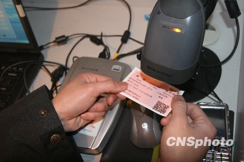 娄底市火车站工作人员在核对旅客用实名制售票卖的火车票和身份证。中新社发 郭国权 摄