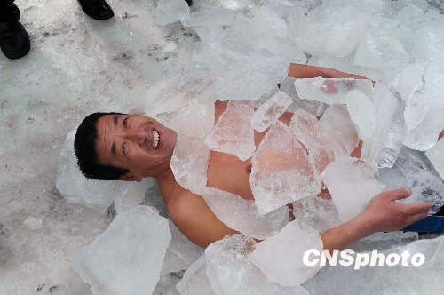 2010年2月17日,黑龙江省牡丹江市冬泳爱好者在牡丹江上凿冰冬泳庆新春。当日,来自市区及辖区东宁县、宁安市的冬泳爱好者在零下20多度的严寒里,以冬泳方式欢度新春佳节。同时,有“耐寒奇人”之称的牡丹江市民陈可财进行了冰上耐寒表演。日前,他在装着冰块的箱子里站立112分钟,超过“冰耐力”110分钟的吉尼斯世界纪录。现年53岁的陈可财自1989年开始进行耐寒锻炼,被当地人称为“耐寒奇人”。