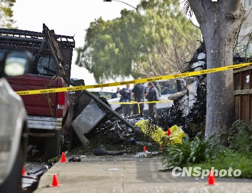 当地时间2月17日上午近8时,一架双引擎小飞机从旧金山南部城市帕洛阿图起飞前往南加州,在机场1英里附近的东帕洛阿图市居民区坠落,机上3人当即死亡。失事飞机还撞击了四间房屋和几辆车子,造成一间房屋起火,所幸地面人员均无伤亡。 图为被烧毁的机翼残骸。中新社发 陈钢 摄
