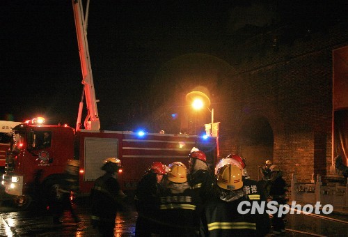 2月18日晚22点23分,消防队员在河北古城正定的南城门展开灭火。现场目击者称:“正定南城门20点30分左右起火,相继有十六、七辆消防车赶来,失火可能是放鞭炮时火苗被大风挂到城上引起”。作为中国历史文化名城,河北正定历史悠久,名胜古迹众多,文化积淀深厚,有“古建筑宝库”的美誉。中新社发 翟羽佳 摄