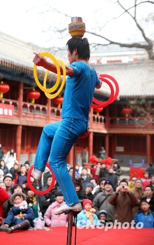 春节期间,北京东岳庙春节文化庙会上的演员们身手不凡,各怀绝技。他们为游客表演的“高车踢碗”、“抖空竹”、“变脸”、“柔术”等精彩杂技,令众多游客拍手称绝。中新社发 陈晓根 摄