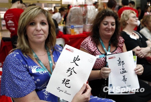 2月19日,展示自己中文名字的人们。中国字在澳大利亚日渐走俏,中文开始在澳大利亚流行起来。中新社发 高周丹 摄