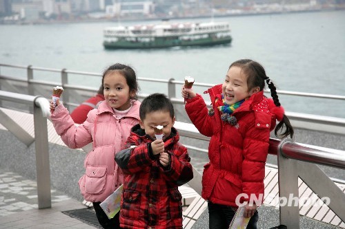 2月19日,三名访港小游客在尖沙咀海滨长廊冒着寒风,兴高采烈享受冰淇淋。当日,香港市区气温降到摄氏7.7度,再创入冬以来新低。中新社发 洪少葵 摄
