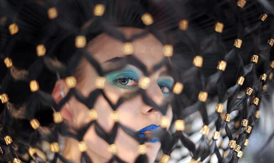 图为模特在伦敦时装周上展示设计师Charlie Le Mindu的服饰。