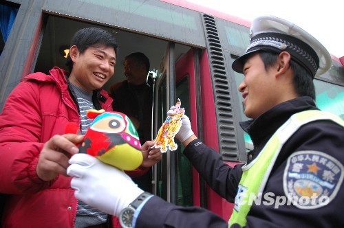 2010年2月20日,山东滨州,新年上班第一天,博兴交警向过往车辆赠送“福”字与布老虎。当日,“温暖向前行--虎年送千福”活动在山东博兴举行,上千张喜庆吉祥的“福”字与上百只五颜六色的布老虎,带着新年的祝福,送到了过往司机与乘客的手中。
