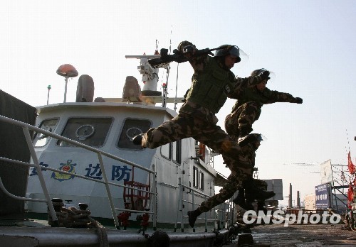 浙江温州边防官兵为世博安保开展码头反劫船演练(2)