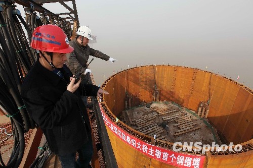 2月22日下午,嘉绍跨江大桥正在实施沉放主墩首个钢围堰。由此标志着从当日开始,位于浙江绍兴和嘉兴的嘉绍跨江大桥开始进入主桥承台施工阶段。首个钢围堰内壁直径39.05米,外壁直径42.05米,高24.5米,总重740吨。整座跨江大桥主航道南北两岸共有6个主墩钢围堰。国家重点工程嘉绍大桥及南北接线工程是《国家高速公路网规划》中“一纵”──沈阳至海口国家高速公路的组成部分,北起乍嘉苏高速南湖枢纽,跨越钱塘江后,南接杭甬高速和上三高速交叉的沽渚枢纽,是浙江省高速公路规划中跨杭州湾的第二通道。计划于2012年底建成通车。中新社发 袁云 摄