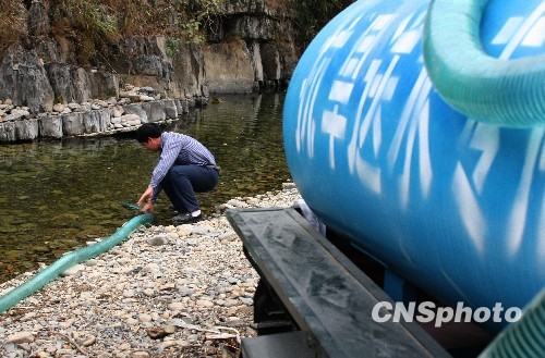 2月23日,广西凤山县长洲乡干部在装水,准备送给缺水群众。中新社发 周恩革 摄