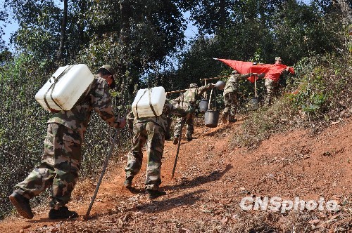 连日来,云南省玉溪市持续高温干旱天气,农作物受旱灾影响极大,武警玉溪市支队红塔区中队积极抽调官兵,帮助老百姓抗旱救灾。参加救灾的战士们从几公里以外,沿着崎岖的山路肩扛背驼把水送到山上,帮助老百姓为秧苗浇水。中新社发 郝亚鑫 摄