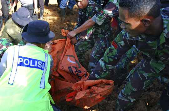 印尼西爪哇省23日发生山体滑坡。据美联社报道,已至少15人死亡,57人仍然被埋。 图为24日士兵与警察继续进行搜救工作。