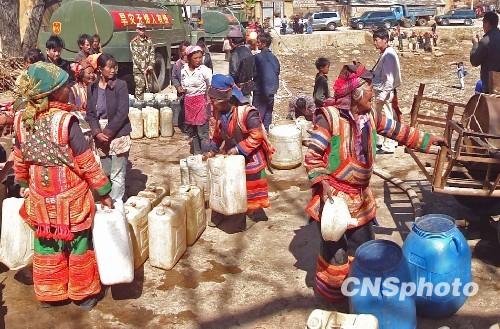 截止目前,旱灾导致云南597万人、359万头大牲畜饮水困难,农业直接经济损失超过100亿元,形势异常严峻。国家防汛抗旱总指挥部于24日启动抗旱Ⅱ级应急响应。图为武警部队送饮用水到蒙自西伯勒乡他期口村委会。中新社发 薛云 摄