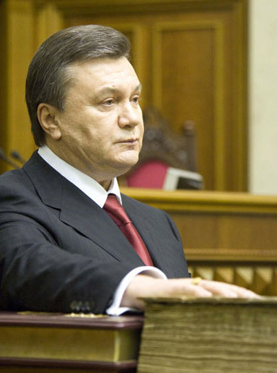 2月25日,在乌克兰首都基辅,新当选的乌克兰总统亚努科维奇在最高议会宣誓就职。在今年2月7日举行的乌克兰总统选举第二轮投票中,地区党领导人亚努科维奇以微弱优势战胜现任总理季莫申科,当选为乌克兰新总统。