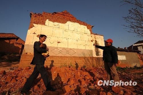 图为受灾群众站在自家受损的房屋前。中新社发 王发增 摄