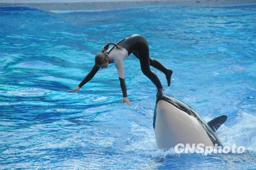 美国佛罗里达奥兰多海洋世界发言人当地时间2月26日说,前日发生的该游乐园虎鲸咬死饲养训练员事件,可能是因为虎鲸受到训练员的发辫吸引而令训练员丧命。图为4个多月前记者在奥兰多海洋世界拍摄的训练员与虎鲸的表演时的画面。中新社发 吴庆才 摄