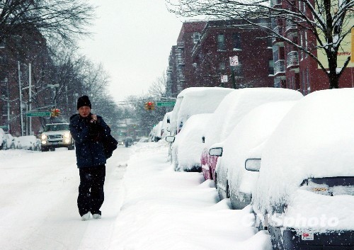 美国东北部地区再度迎来暴风雪袭击。当地时间26日晨,在一天一夜的降雪之后,纽约市的积雪已经超过30厘米,降雪还在继续。图为26日早上雪中的纽约法拉盛街道。中新社发 孙宇挺 摄