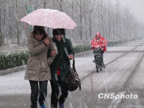 2月28日,山东潍坊市民在城区福寿东街上冒雪行走。中新社发 王晓光 摄
