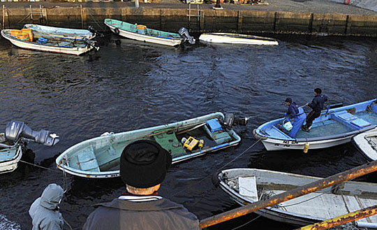 2月28日,在日本宫城县,渔民在港口查看情况。