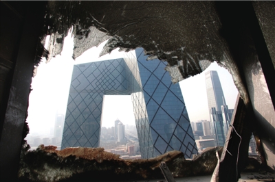 2009年2月9日,在建的央视新台址园区,因单位违法燃烧烟花,发生特别重大火灾事故。时隔一年,不少来往于东三环的车辆经过事发地点时,还不忘放慢车速,观望一下过火大楼的模样。