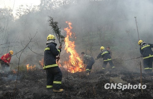 3月1日,消防官兵们、辖区干警和万盛社区工作人员在奋力灭火。当日,由于天气干燥,四川省广安市万盛社区蛇龙山景区与蛇龙村交界处突发山火,大火顺着风向到处蔓延,临近村民住房受到严重威胁。经大家齐心协力,一小时后大火被扑灭。据悉,此次着火面积接近十亩。目前,事故原因在进一步调查之中。