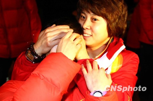 图为王濛在和小队员相互庆祝。中新社发 富田 摄
