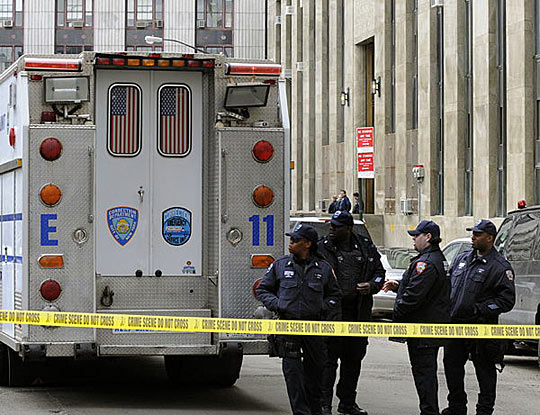 图为消防人员站在美国纽约曼哈顿刑事法院大楼外。
