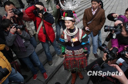 3月5日,十一届全国人大三次会议在北京人民大会堂开幕。身着民族服饰的人大代表雷阿幼朵引人关注。中新社发 汤彦俊 摄
