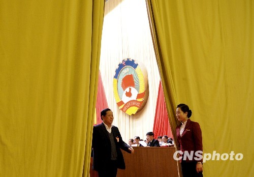 3月7日,全国政协十一届三次会议第二次全体会议在北京人民大会堂举行,主席台上的服务员为委员出入撩起门帘。中新社发 廖攀 摄