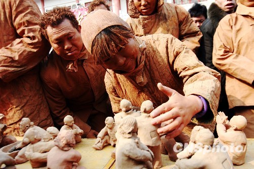 3月7日,一群“泥人”在河南浚县庙会上自制泥玩具并将与现场商贩交换商品。这次“大地上的人”艺术活动是“王刚——老万系列作品”的第五次行为艺术活动。“老万”代表“千千万万”。本次活动的主题从关注农民工扩展到了关注人类的生存与发展。