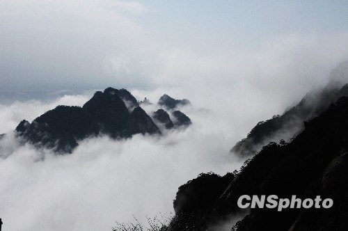 3月7日,安徽黄山风景区微雪放晴,云雾弥漫,山峰若隐若现,出现了虎年首场蔚为壮观的云海,令中外游客大饱眼福。 中新社发 葛军 摄