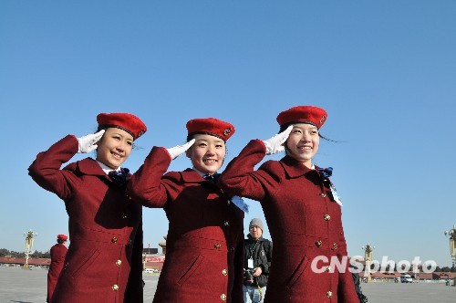 十一届全国人大三次会议、全国政协是一届三次会议在京举行,3月10日两会服务人员在天安门广场留下自己的美丽的瞬间。