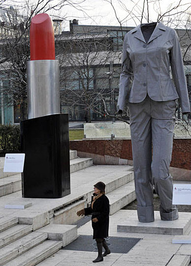 一名参观者走过口红和女装形状的巨型雕塑。