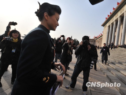 3月13日上午,全国政协委员、海军政治部文工团副团长宋祖英在记者的簇拥下,走向北京人民大会堂参加全国政协十一届三次会议闭幕会。中新社发 贾国荣 摄