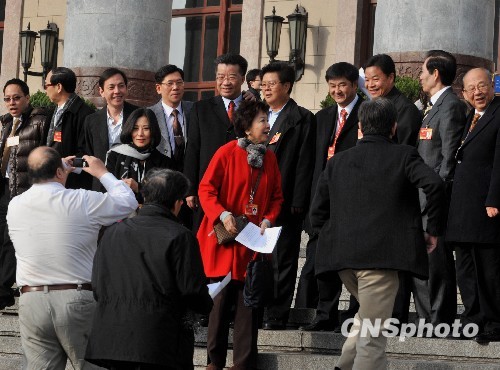 3月13日上午,香港的全国政协委员们在北京人民大会堂前集合,参加全国政协十一届三次会议闭幕会。中新社发 贾国荣 摄
