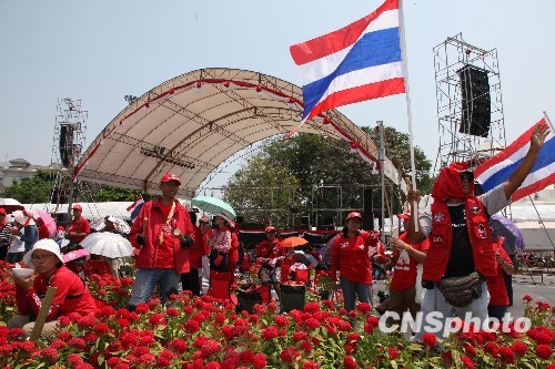 泰国红衫军陆续抵达曼谷搭设演讲舞台展开示威。中新社发 顾时宏 摄