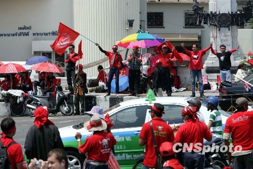 图为在民主纪念碑广场挥着红色的旗帜,穿着红色衣衫的红衫军按计划开始了他们倒国会、重新大选的行动。中新社发 洪少葵 摄