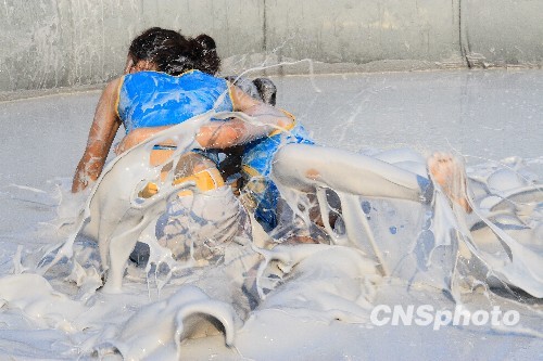 3月14日下午,“2010世界比基尼美女泥浆博击比赛”预赛在海口市假日海滩景区举行。中新社发 周欣闻 摄