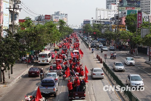 3月15日,泰国“红衫军”数万人驾车浩浩荡荡前往曼谷第11步兵营进行示威活动。11步兵营位于曼谷北部,距离“红衫军”在繁华桥中心聚集点约20公里,是“红衫军”举行示威活动后泰国政府设立的局势监控指挥中心据点,泰国总理阿披实、陆军总司令阿努蓬等军政要员都暂住在该营地。中新社发 顾时宏 摄