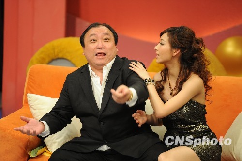 图为王晶受到女主播温雅“挑逗”坐怀不乱,指着记者大喊有人偷拍,让现场笑翻。中新社发 李学仕 摄
