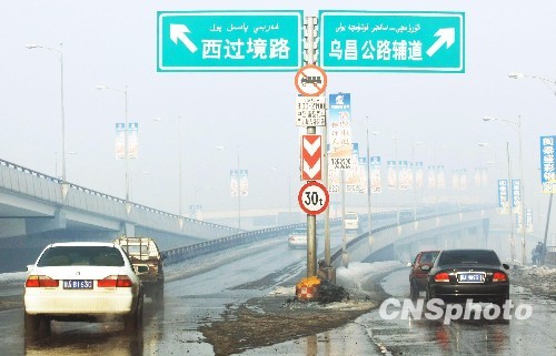 15日晚,一场雨夹雪光临乌鲁木齐市,致使道路结冰湿滑难行,随着白天气温升高,路面冰雪开始消融,致使城北区域雾气浓重。中新社发 刘新 摄